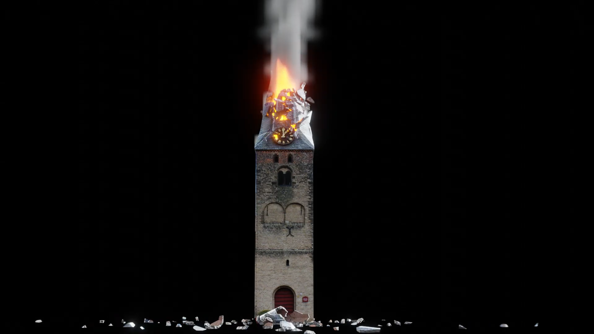 After we tested the first version by projecting it on the church I had to make adjustments. Although a enitre collapse of the tower is very cool to see, it had to be more historically correct so I reduced the overall destruction, fire and smoke a lot. The final projection is a 20 minutes looping animation. In those 20 minutes chunks of the front wall and roof fall to the ground, fire appears out one of the gaps and finally smoke comes out the front window.